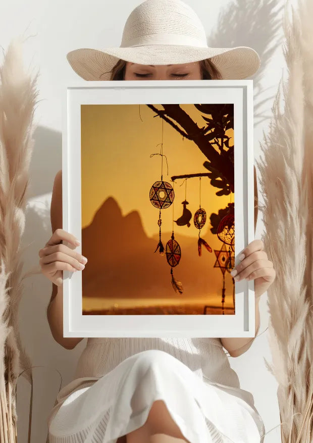 Każdy szczegół na tym plakacie emanuje spokojem i głęboką refleksją. Łapacze snów, zawieszone na tle odległych gór, tworzą niepowtarzalny klimat wieczornego mistycyzmu. Idealny dla tych, którzy cenią sobie chwile samotności i duchowej harmonii, pozwala odciąć się od codziennych trosk i zanurzyć w ciepłym, otulającym blasku.