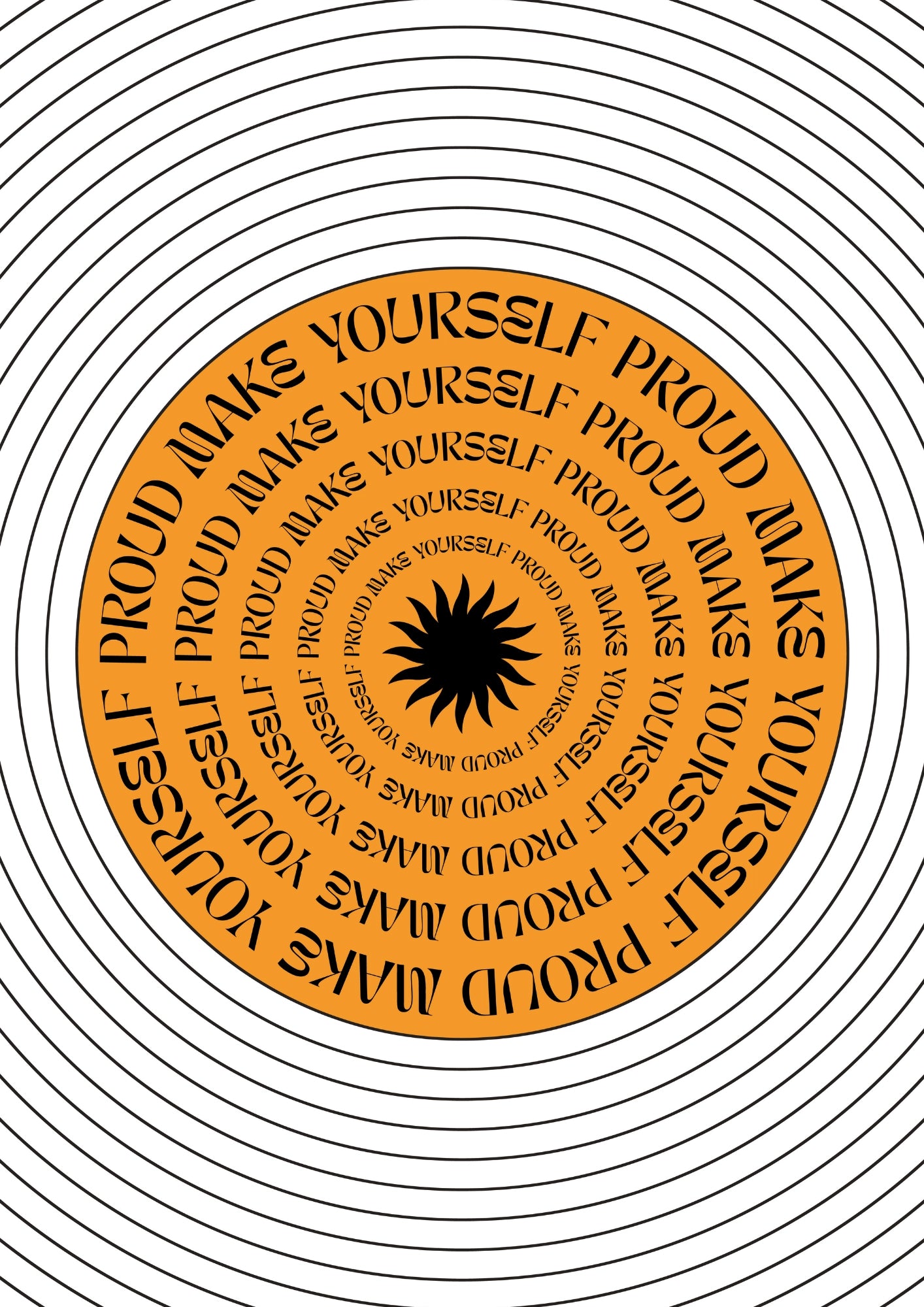 Wizualnie plakat oddaje balans między geometrią a inspiracją. Okręgi wciągają wzrok do centrum, gdzie czeka na Ciebie mocne przesłanie. Żółty odcień i czarna typografia budują kontrast, który podkreśla istotę przesłania – by być dumnym z siebie każdego dnia.