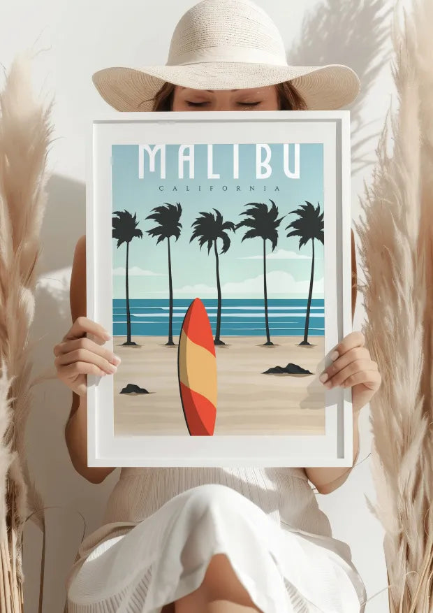 Plakat Malibu California to esencja kalifornijskiego stylu życia – miejsca, gdzie słońce, plaża i surfing tworzą niepowtarzalną atmosferę. Przedstawiając spokojny ocean, smukłe palmy i charakterystyczną deskę surfingową, ten obraz przenosi Cię prosto na gorące piaski Malibu, gdzie każdy dzień jest pełen przygód i relaksu.