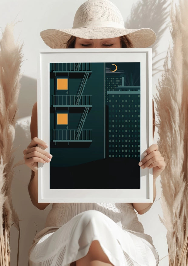 Ten plakat przeniesie Cię do spokojnych, nocnych ulic metropolii. Uchwycony widok miejskiego budynku z charakterystycznymi przeciwpożarowymi schodami na tle ciemnego nieba i rozświetlonego księżyca wprowadza niepowtarzalny klimat wieczornego spokoju. Ciepłe światło z okien kontrastuje z chłodną kolorystyką budynków, tworząc atmosferę tajemnicy i ciszy, którą można odczuć tylko po zmroku.Minimalizm, który mówi wiele