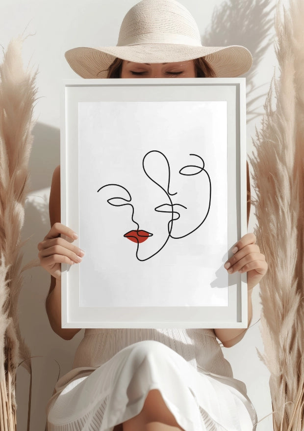 Minimalistyczny Jedna Linia - Twarz z Czerwonymi Ustami Plakat