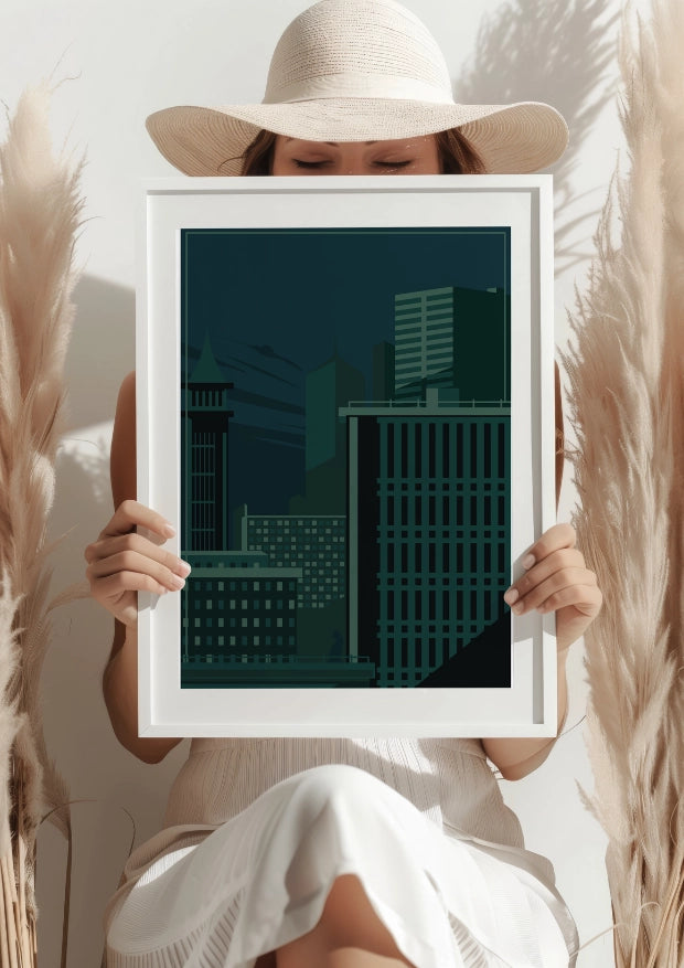 Ten plakat przedstawia tajemniczy i surowy pejzaż miejskiej metropolii skąpanej w nocy. Wysokie budynki i ciemne, zarysowane linie dodają atmosferze plakatu głębi oraz aurę niebezpieczeństwa, a zarazem spokoju. Utrzymany w ciemnych odcieniach zieleni, od razu przyciąga uwagę swoją elegancją i minimalistycznym stylem.Wprowadź miejski klimat do swojego wnętrza