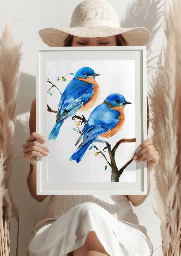 Akwarelowe pociągnięcia pędzla podkreślają wyjątkową grację i lekkość tych ptaków, a gałęzie, na których siedzą, tworzą naturalną, organiczną ramę dla kompozycji. Niebieskie pióra kontrastują z delikatnymi, pomarańczowymi akcentami, dodając kompozycji subtelnej dynamiki, która idealnie komponuje się z minimalistycznym stylem każdego wnętrza.