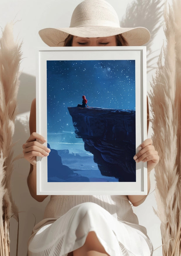Poznaj magię wieczoru uchwyconą na naszym plakacie "Nocna Cisza na Klifie". Ten wyjątkowy obraz wprowadza nas w świat pełen tajemnic i spokojnej melancholii, którą niesie ze sobą nocne niebo usiane gwiazdami. Klif, na którym postać zatapia się w odmętach piękna wieczoru, staje się mostem między rzeczywistością a marzeniami, a każda chwila spędzona na jego podziwianiu przynosi wewnętrzny spokój.Zanurz się w Detalach
