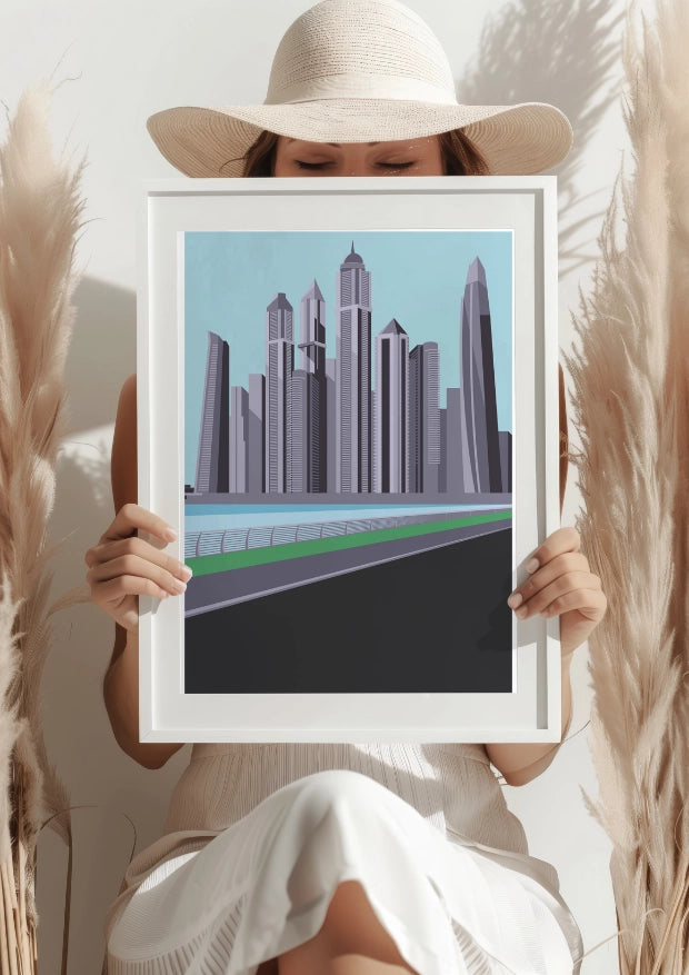 Plakat przedstawiający ultranowoczesną panoramę wieżowców na tle jasnego nieba to idealne odzwierciedlenie dynamizmu współczesnego miasta. Zastosowana perspektywa uwypukla monumentalność budowli, które dominują nad miejskim bulwarem, tworząc obraz przyszłości już dziś. Doskonały wybór dla miłośników miejskich krajobrazów i nowoczesnego designu.Prostota formy i elegancja detalu