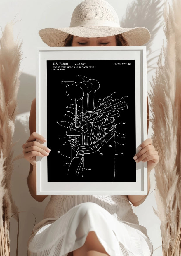 Ten plakat na czarnym tle przedstawia patent na ergonomiczną torbę golfową z separatorem kijów. Rysunek techniczny pokazuje precyzję oraz nowatorskie rozwiązania, które ułatwiają życie golfistom, gwarantując doskonałą organizację sprzętu. Dzięki temu separatorowi każdy kij ma swoje dedykowane miejsce, co ułatwia ich szybkie i wygodne wyciąganie podczas gry.Komfort użytkowania dzięki unikalnemu patentowi