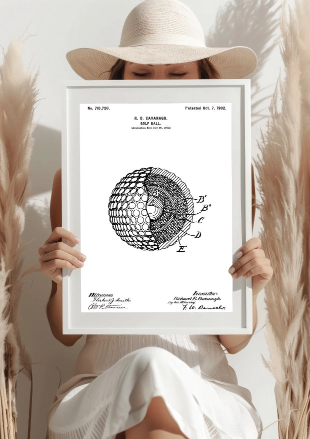 Ten plakat na Białym tle przedstawia patent na piłkę golfową autorstwa R.B. Cavanagha, który został zatwierdzony w 1902 roku. Rysunek techniczny przedstawia wewnętrzną strukturę piłki, która była innowacyjnym rozwiązaniem, pozwalającym na lepsze osiągi i kontrolę podczas gry. To doskonały przykład, jak precyzyjna inżynieria zmieniała zasady golfa na początku XX wieku.Nowatorska konstrukcja dla precyzyjnych wyników