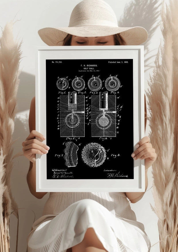 Patent ten pokazuje nie tylko techniczne szczegóły budowy piłki golfowej, ale także innowacje, które miały na celu poprawę jej aerodynamiki i wytrzymałości. Dzięki temu projektowi piłka golfowa stała się bardziej precyzyjna, zapewniając lepsze osiągi dla graczy i rewolucjonizując ten sport na początku XX wieku.Klasyczny design na eleganckim czarnym tle