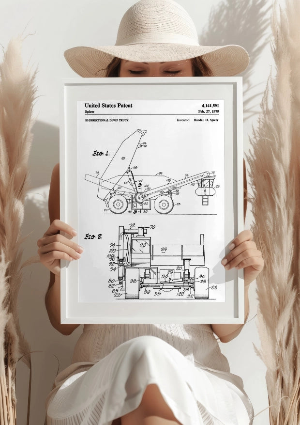 Ten plakat na Czarnym tle przedstawia szczegółowy rysunek techniczny patentu na wywrotkę dwukierunkową, stworzoną przez Randalla O. Spicera w 1979 roku. Rysunek przedstawia przełomową konstrukcję, która umożliwia rozładunek w dwóch kierunkach, znacząco poprawiając efektywność i wszechstronność wywrotki na placach budowy.Praktyczna konstrukcja dla lepszej efektywności
