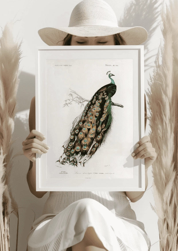 Oto plakat przedstawiający niezwykle majestatycznego pawia w pełnej okazałości. Jego długie, wielobarwne pióra mienią się odcieniami zieleni, błękitu i złota, oddając niepowtarzalne piękno natury. Ta ilustracja zachwyci każdego miłośnika elegancji i klasyki, wprowadzając do wnętrza element wyrafinowanego stylu.Pełnia detali i mistrzowska kreska