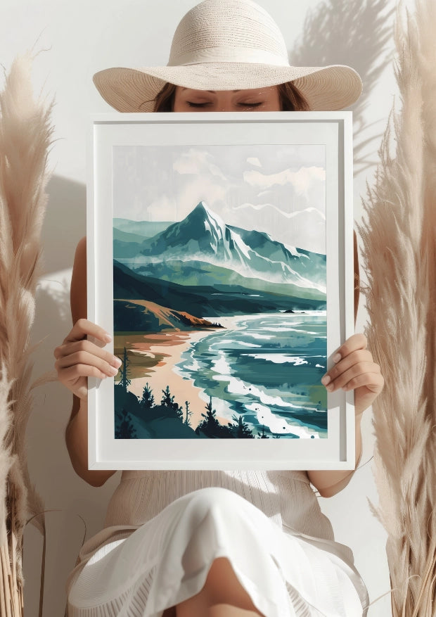 Plakat "Pejzaż Gór i Zatoki w Świetle Poranka" to harmonijne połączenie majestatycznych gór z delikatnym wybrzeżem, które odbija w sobie pierwsze promienie porannego słońca. Z jednej strony surowość skalistych szczytów, z drugiej łagodna linia zatoki tworzą niezwykły obraz harmonii natury.Nowoczesna interpretacja krajobrazu