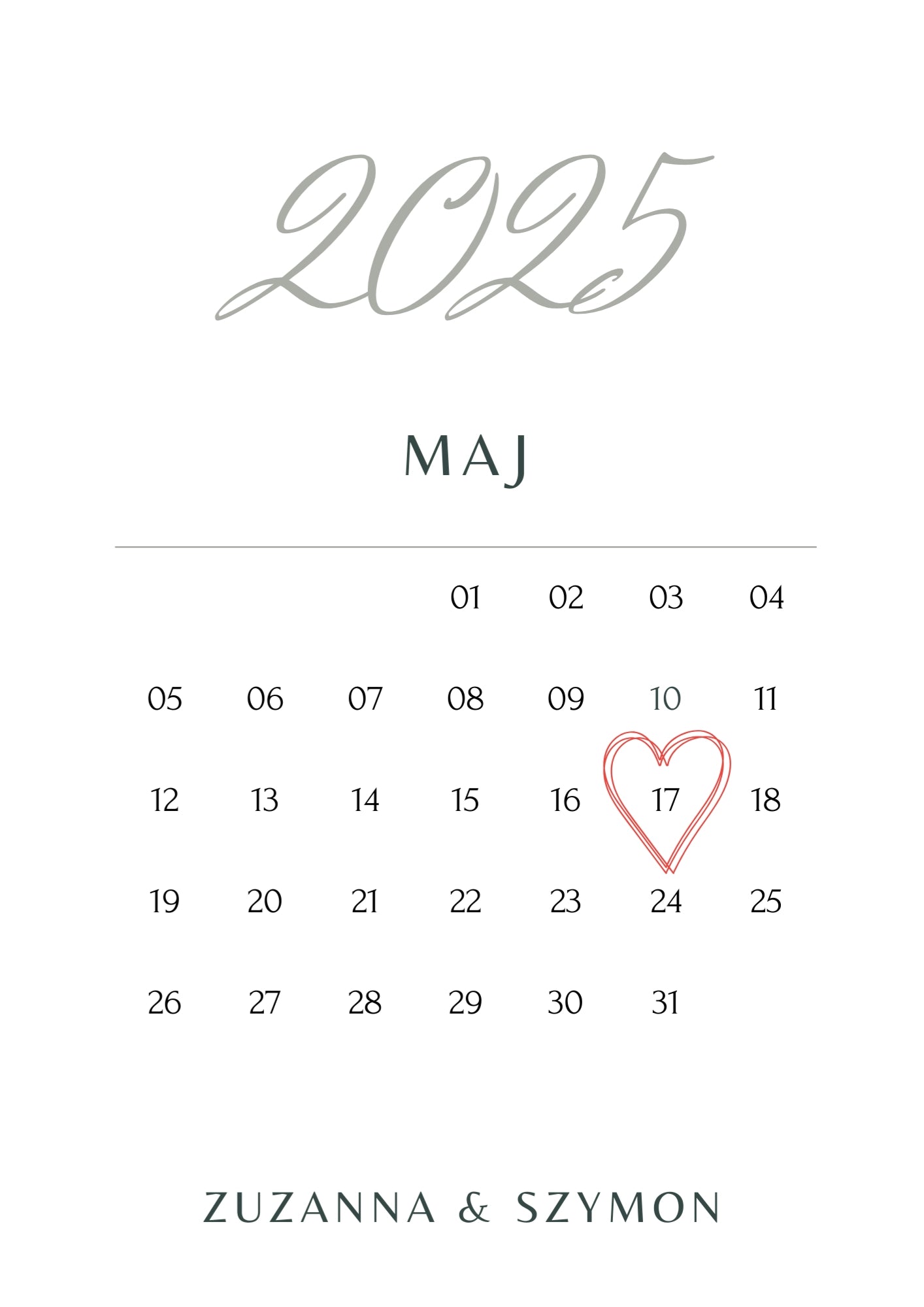Minimalistyczny kalendarz z wyróżnionym sercem dniem to prosty, ale wymowny symbol. Imiona oraz rok dodają osobistego charakteru, a elegancka typografia i delikatna kolorystyka sprawiają, że plakat pasuje do każdego wnętrza. Będzie świetnie prezentować się w sypialni, salonie lub wśród wspólnych zdjęć.