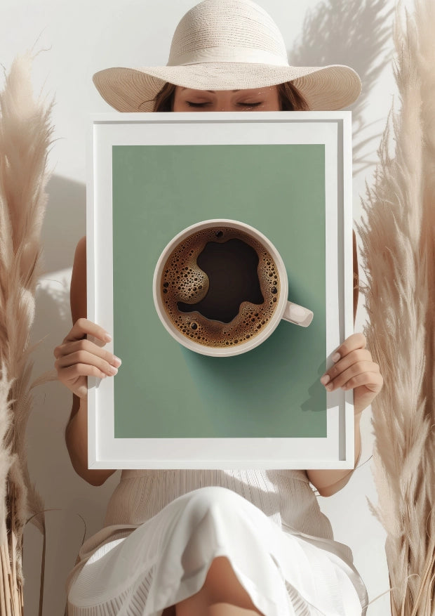 Prezentowana na plakacie kawa, z jej bogatymi detalami i głęboką czernią, przyciąga wzrok i nadaje pomieszczeniu niepowtarzalny klimat. Subtelna zieleń w tle przynosi uczucie świeżości i harmonii, czyniąc z tego plakatu idealny dodatek do każdej przestrzeni – od nowoczesnych wnętrz po przytulne kawiarniane kąciki.Twój Dzień, Twoja Chwila