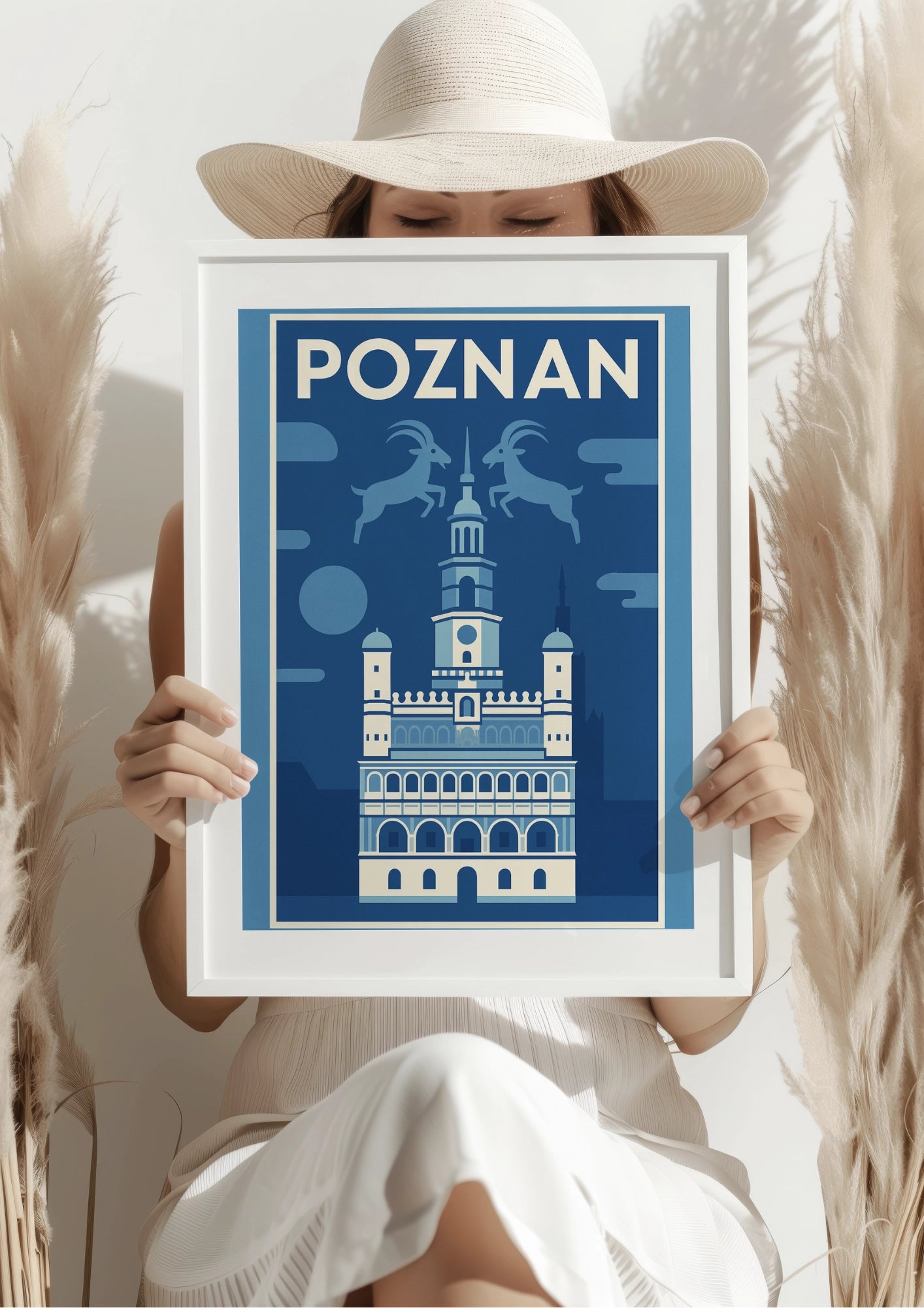 Ten plakat to minimalistyczna oda do jednego z najbardziej znanych miejskich symboli w Polsce – poznańskiego ratusza i jego legendarnych koziołków. Zatrzymany w odcieniach błękitu, budynek rozbłyskuje na tle nieba, a dwa koziołki unoszą się tuż nad wieżą, jakby właśnie miały rozpocząć swoje słynne tryknięcie. To nie tylko kadr z codziennego spektaklu – to pocztówka z duszą miasta.