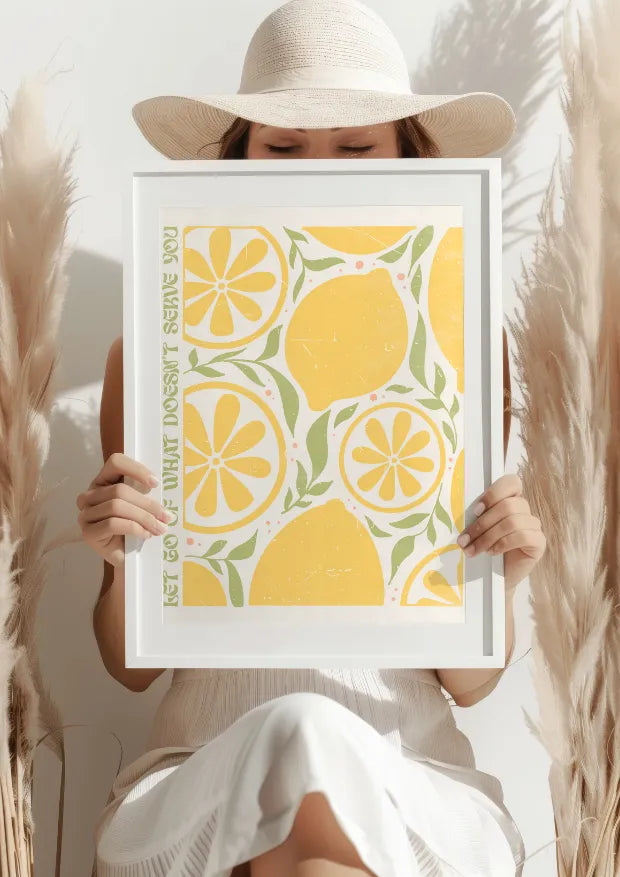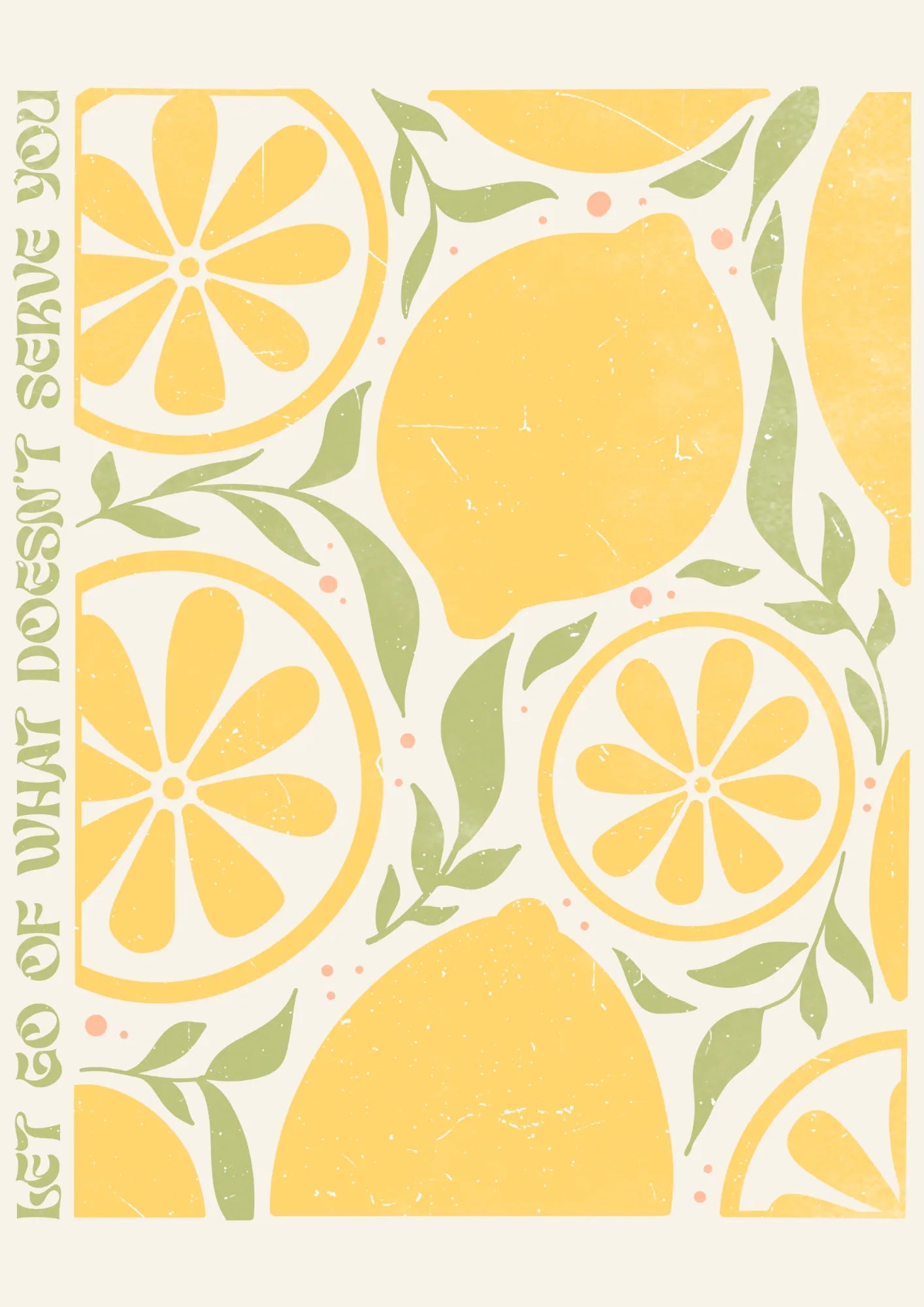 Plakat „Puść To, Co Cię Nie Służy” to pełna świeżości kompozycja cytryn i liści, które symbolizują odnowę i odrzucenie tego, co zbędne. Żółte cytryny emanują energią i radością, a towarzyszące im zielone liście przypominają o harmonii i spokoju, jakie możemy osiągnąć, rezygnując z tego, co nas obciąża.