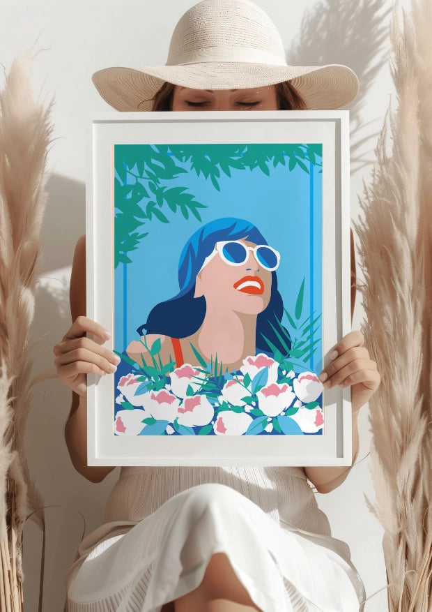 Plakat "Radość Letniego Słońca" to uosobienie beztroski i szczęścia, jakie niesie ze sobą letni czas. Kobieta w okularach przeciwsłonecznych, otoczona bujną roślinnością, cieszy się chwilą pełną światła i pozytywnej energii. Ten obraz oddaje ducha lata, zapraszając Cię do zanurzenia się w jego ciepłej atmosferze.Soczyste kolory, które ożywią każde wnętrze