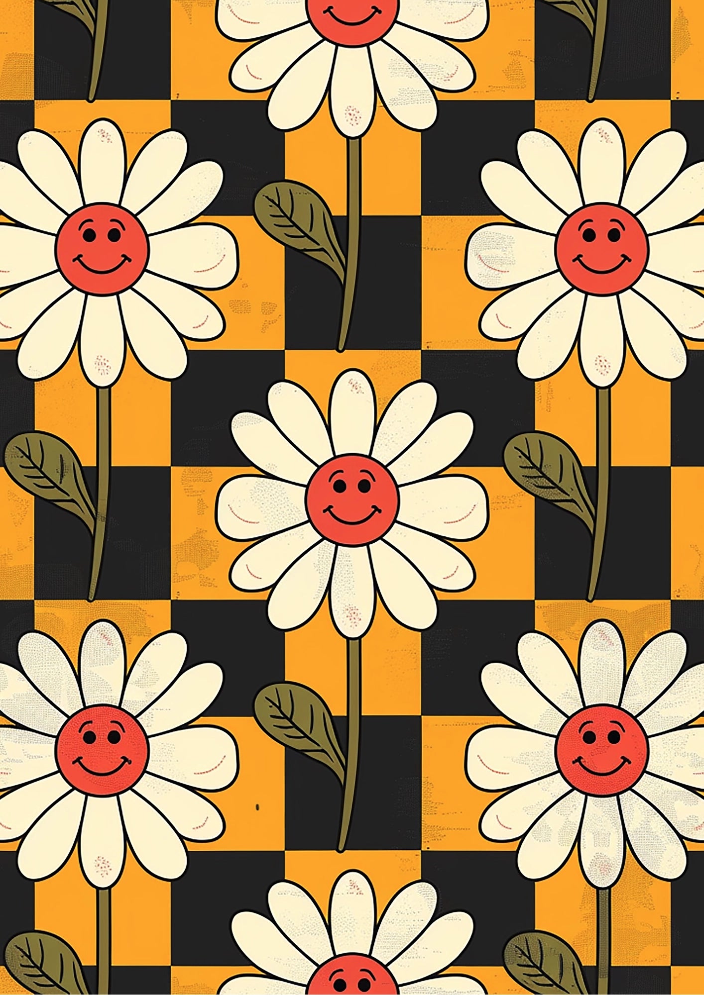 Ten plakat "Radosne Kwiaty na Geometrycznym Tle" to kompozycja, która natychmiastowo rozjaśni Twoje mieszkanie. Sympatyczne kwiaty z uśmiechniętymi buziami w połączeniu z odważnym wzorem w żółto-czarne kwadraty tworzą energetyczny i zabawny efekt, idealny do każdego wnętrza, które potrzebuje odrobiny radości.Zabawa formą i kolorem