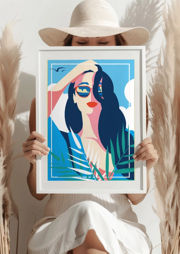 Plakat "Refleksja Letnich Dni" przedstawia kobietę, która w pełni oddaje się chwili, ciesząc się ciepłem letniego słońca. Jej okulary przeciwsłoneczne odbijają spokojny widok morza i nieba, przypominając nam o tych niezapomnianych letnich chwilach. Jest to opowieść o relaksie, beztrosce i chwilach, które zapamiętujemy na zawsze.Dynamiczny obraz pełen koloru