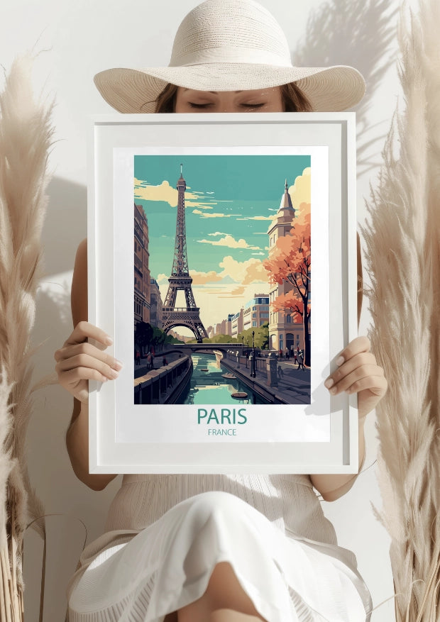 Podziwiaj urok stolicy Francji, uchwycony na tym plakacie, gdzie Wieża Eiffla dumnie góruje nad miastem, a spokojny kanał otacza piękne paryskie uliczki. Plakat, który oddaje ducha Paryża – miasta miłości i sztuki.