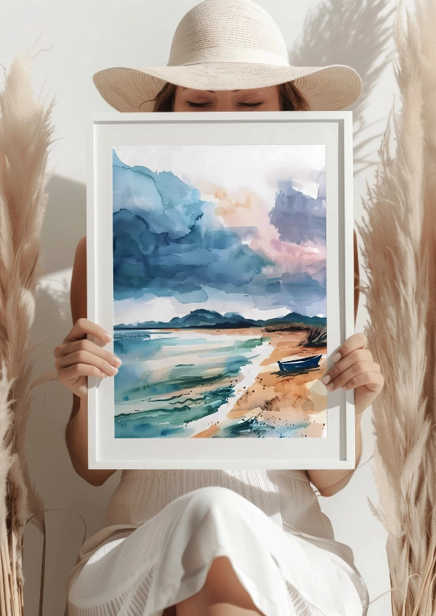 Plakat "Samotna Łódź na Plaży" to nostalgiczne ujęcie cichego brzegu, gdzie morze delikatnie spotyka się z piaskiem, a na horyzoncie rozciągają się majestatyczne góry. Samotna łódź, porzucona na brzegu, budzi refleksje o minionych podróżach, tęsknocie za przygodą i pięknie spokoju natury. Każdy detal tego plakatu przyciąga uwagę i zachęca do chwili zadumy.Idealna Dekoracja Dla Miłośników Natury