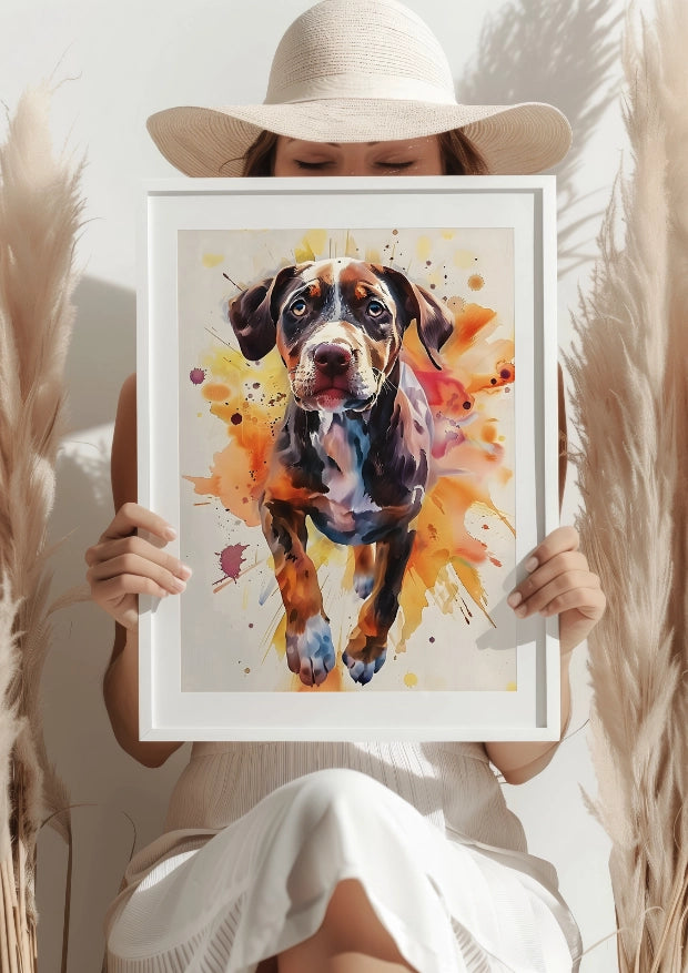 Artystyczne ujęcie szczeniaka w technice akwarelowej nadaje mu wyjątkową lekkość i subtelność. Plakat doskonale oddaje niewinność i radość życia młodego psa. Każdy ruch pędzla podkreśla nie tylko urok zwierzęcia, ale także radość, którą przynosi swoim widokiem.