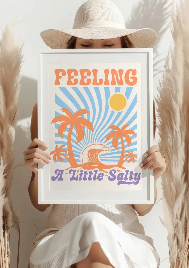 Plakat „Słoneczne Wakacje z Nutą Słoności” to idealny sposób, aby przenieść się na egzotyczną plażę, nawet nie wychodząc z domu. Wyraziste, pastelowe kolory pomarańczowych palm, falujących morskich bryz oraz promieni słońca tworzą wrażenie beztroski i radości, które kojarzą się z letnim wypoczynkiem.