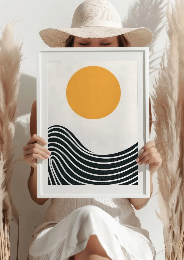 Plakat emanuje prostotą i artyzmem, przedstawiając subtelnie falujące linie pod złotym słońcem. Wykorzystane kolory wprowadzają spokój i ciepło, a wysokiej jakości materiały gwarantują trwałość i estetykę na długie lata. Każdy element składa się na opowieść o czasie, który warto zatrzymać w sercu domu.Zanurz się w chwili ciszy