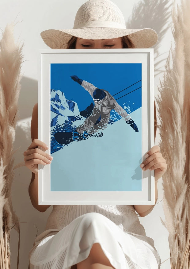 Plakat "Snowboardzista na stoku górskim" to dynamiczne uchwycenie chwili, kiedy snowboardzista kontroluje każdy ruch podczas szybkiego zjazdu. Sceneria ośnieżonych gór w tle i intensywny niebieski kolor nieba podkreślają majestatyczną potęgę natury, z którą zmaga się bohater tej sceny.Odezwij się do swojego wewnętrznego ryzykanta