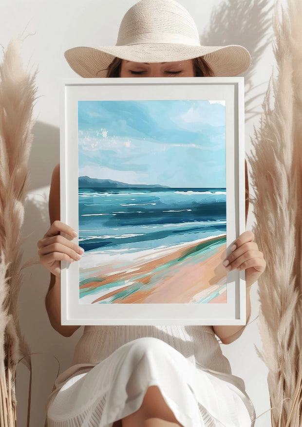 Subtelne odcienie błękitu, turkusu i beżu sprawiają, że plakat ten emanuje spokojem i harmonią. Wspaniała perspektywa, ukazująca zarówno plażę, jak i dalekie góry na horyzoncie, tworzy przestrzeń do refleksji i odprężenia.Idealny na Każdą Ścianę