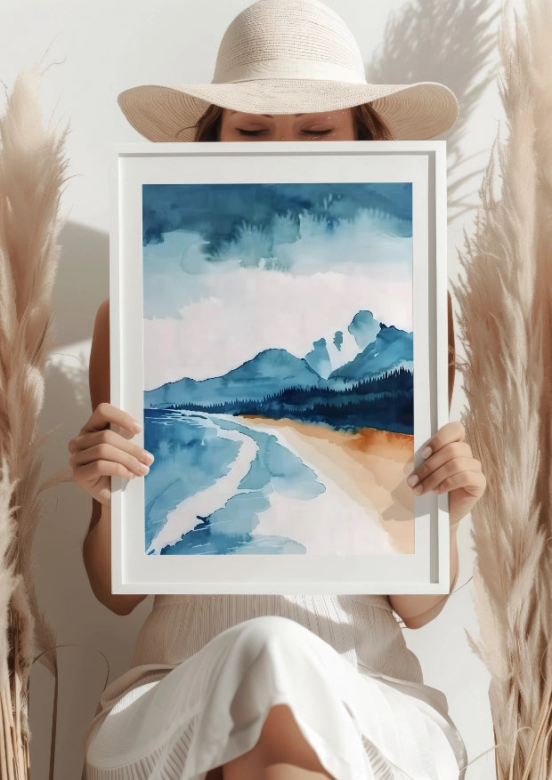 Plakat "Spokojna Plaża z Górami" wprowadza atmosferę ciszy i harmonii. Błękitne odcienie nieba i wody z subtelnymi akcentami piasku tworzą idealne tło dla majestatycznych gór. Ten obraz łączy w sobie spokój morza z siłą natury.Dodaj harmonię do swojego wnętrza