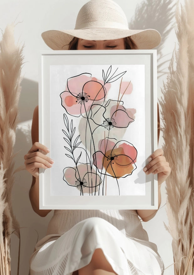Ten plakat łączy delikatność z nowoczesną sztuką, tworząc minimalistyczny design kwiatów otoczonych pastelowymi plamami. Zarysowane w subtelny sposób kwiaty idealnie wpisują się w styl współczesnych wnętrz, dodając im delikatności i artystycznego wyrafinowania.Ciepłe Pastelowe Barwy dla Harmonii Wnętrza