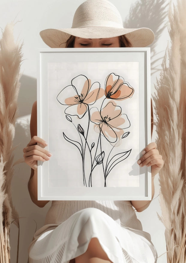 Ten plakat przedstawia subtelne kwiaty w minimalistycznym stylu, ukazane za pomocą delikatnych, płynnych linii. Ich subtelne kształty w połączeniu z delikatnymi pastelowymi odcieniami pomarańczu tworzą wrażenie lekkości i harmonii. Idealny wybór dla miłośników prostoty z nutą elegancji.Minimalistyczna Doskonałość