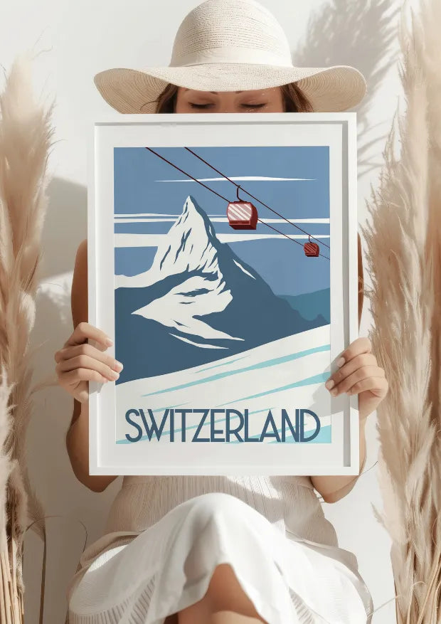 Plakat Switzerland Alpine Gondola przenosi Cię w sam środek majestatycznych szwajcarskich Alp, gdzie wznoszące się szczyty i niebiańskie krajobrazy zachwycają swoją surową urodą. Zdominowany przez imponujący widok Matterhornu, ten obraz to esencja alpejskiego doświadczenia, gdzie nowoczesność gondoli spotyka się z ponadczasowym pięknem gór.