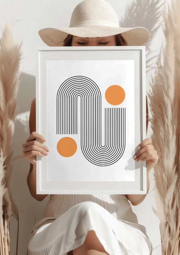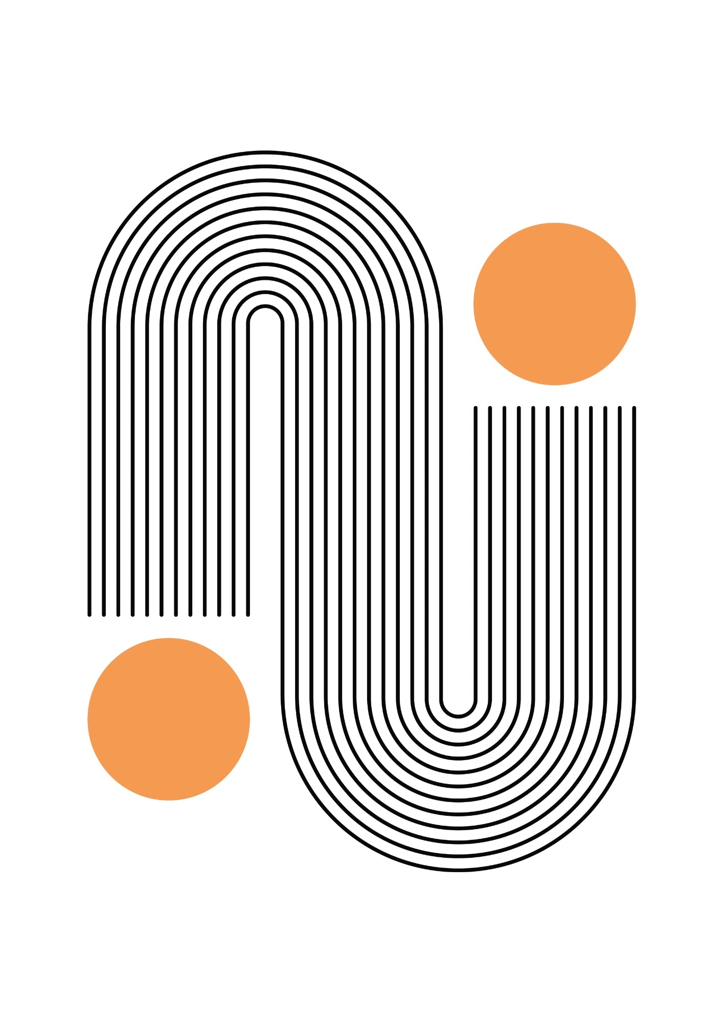 Ten plakat to doskonały przykład, jak prostota może być niezwykle efektowna. Użycie precyzyjnych czarnych linii i geometrycznych kształtów przyciąga wzrok, a pomarańczowe okręgi dodają ciepła i wyrazu, kontrastując z monochromatycznym tłem.Geometryczna harmonia
