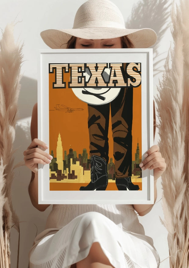 Ten plakat doskonale oddaje klimat Teksasu, łącząc jego kowbojski styl z nowoczesnym miejskim krajobrazem. Widoczne kowbojskie buty na tle tętniącego życiem miasta symbolizują wyjątkową mieszankę tradycji i nowoczesności, która czyni Teksas miejscem pełnym różnorodności.