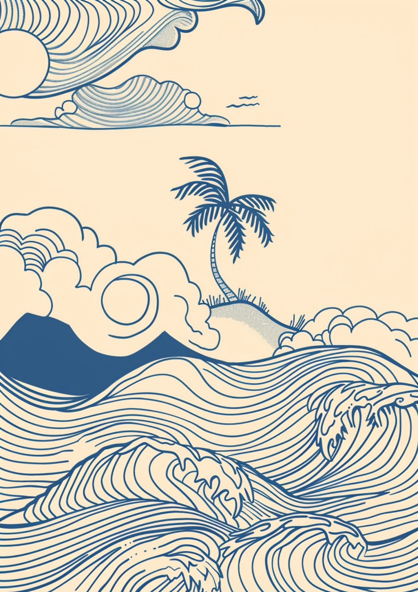 Wydrukowany na wysokiej jakości papierze, "Tropikalne Fale Pod Palmą" łączy w sobie trwałość z estetyką. Elegancka linia rysunku przywodzi na myśl ręczne szkice artystów, którzy widzieli piękno tropików na własne oczy. Dzięki starannie dobranym detalom, plakat ten z łatwością wpisuje się w różnorodne style aranżacji – od nowoczesnych po boho.Ucieczka do tropikalnego raju