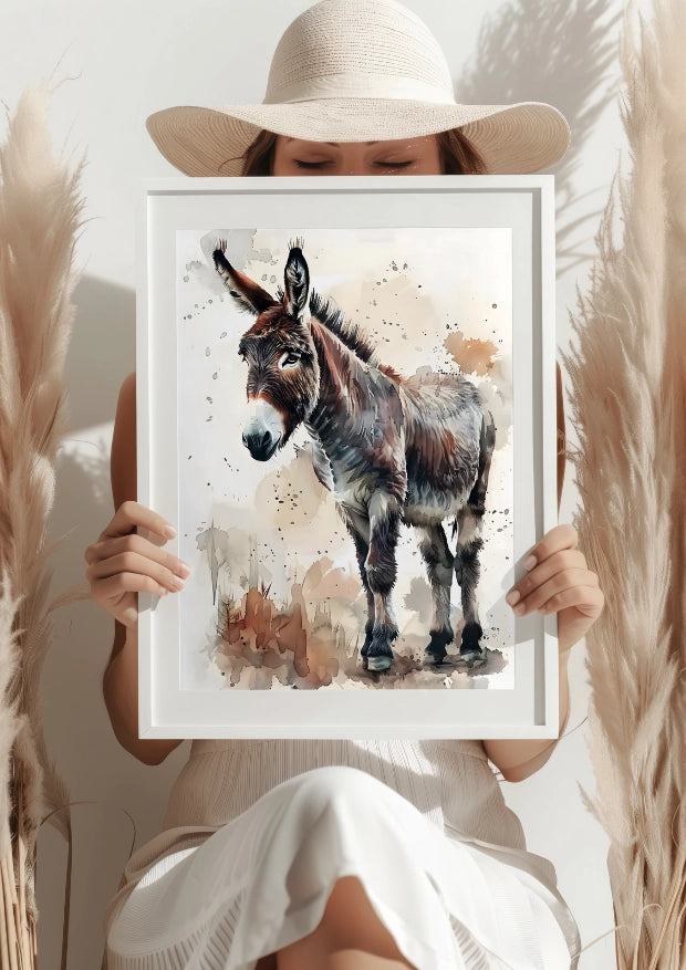 Artystyczny styl akwareli nadaje temu plakatowi niesamowitą lekkość i miękkość. Ciepłe, stonowane kolory świetnie kontrastują z precyzyjnie oddaną fakturą futra osiołka, podkreślając jego przyjazną i ciepłą osobowość. Plakat doskonale komponuje się w naturalnych, rustykalnych wnętrzach.