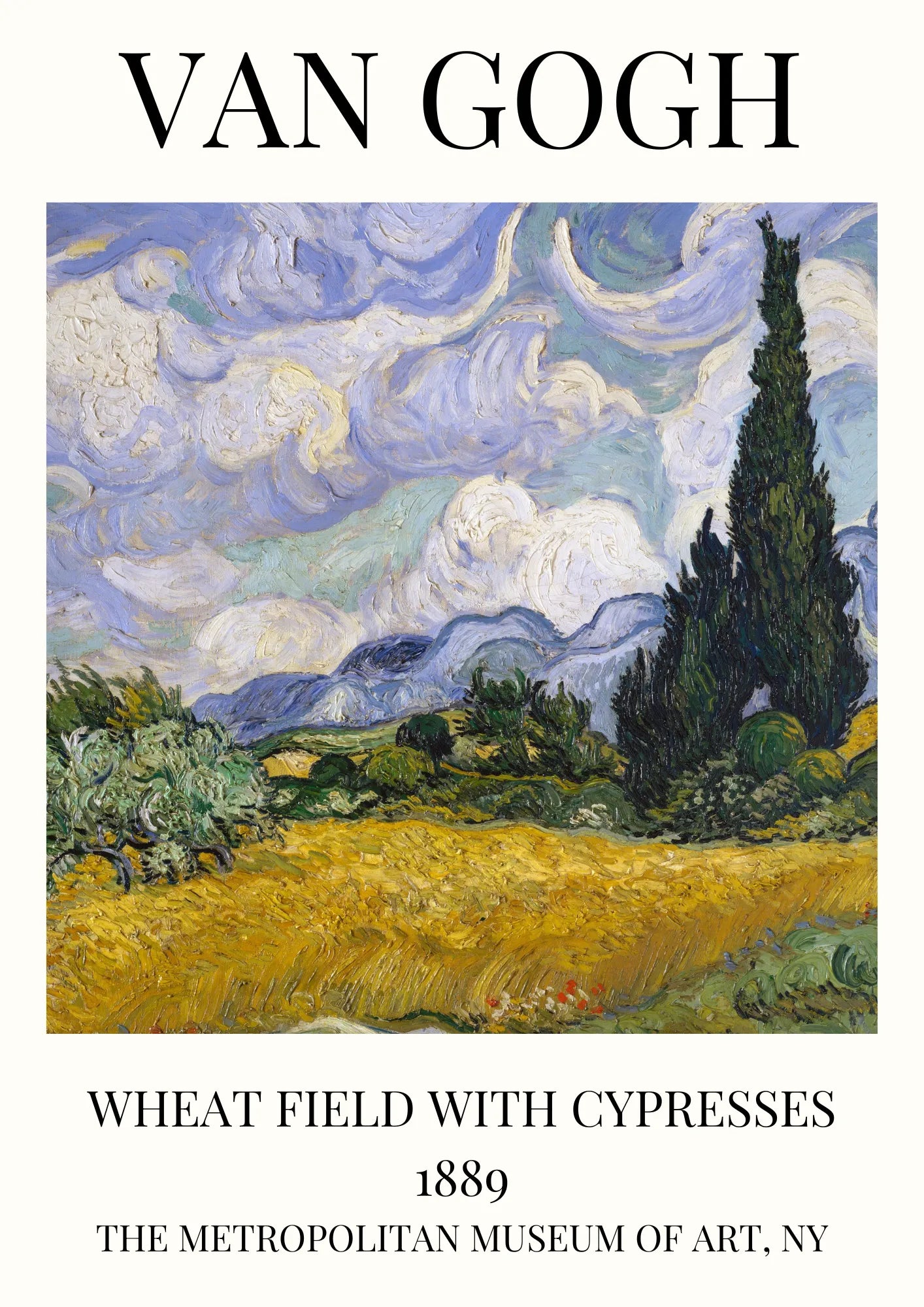 Plakat „Van Gogh Pole Pszenicy z Cyprysami 1889” to wyraz niezwykłej energii i pasji, z jaką Vincent van Gogh przedstawiał naturę. To dynamiczne dzieło oddaje potęgę przyrody – gęste, falujące pole pszenicy w połączeniu z majestatycznymi cyprysami, pod burzliwym niebem pełnym wirujących chmur. Każdy szczegół tej kompozycji tętni życiem i emocjami, które Van Gogh przelał na płótno.