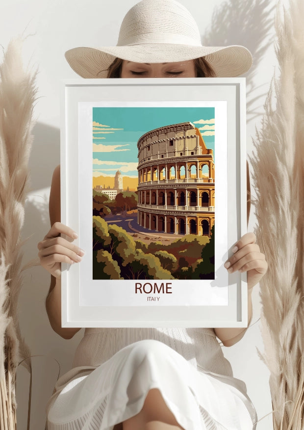 Ten wyjątkowy plakat przedstawia majestatyczne Koloseum — symbol potęgi i splendoru antycznego Rzymu. Jego wspaniała architektura wznosi się nad krajobrazem, opowiadając historię starożytnych gladiatorów i wielkich cesarzy, którzy nadali miastu niezatarte piętno.