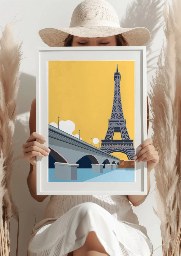 Linie mostu i geometryczna struktura Wieży Eiffla doskonale kontrastują z delikatnym tłem złocistego nieba. Ten plakat to kwintesencja francuskiej klasyki w nowoczesnym ujęciu. Stworzy piękne tło dla minimalistycznych i klasycznych aranżacji wnętrz, nadając im subtelnego wyrafinowania.Dodaj francuski szyk do swojej przestrzeni
