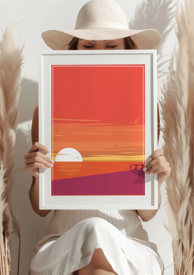 Plakat przedstawia piękny moment, kiedy słońce powoli znika za horyzontem, zanurzając plażę w ciepłych odcieniach czerwieni i pomarańczy. To idealne ujęcie nadmorskiego relaksu, gdzie parasole i leżaki czekają na spokojny wieczór. Minimalistyczna forma wciąga widza w hipnotyzującą grę świateł i cieni, tworząc niepowtarzalny klimat.Perfekcyjna ozdoba Twojego wnętrza