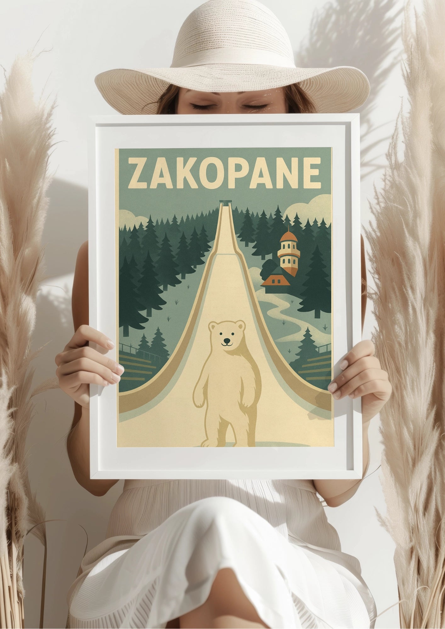 Ten urokliwy plakat przenosi nas wprost do zimowej stolicy Polski – Zakopanego. Na pierwszym planie dumnie stoi niedźwiedź, symbol górskiej dzikości i łagodności jednocześnie, a za nim wznosi się słynna Wielka Krokiew – ikona sportów zimowych i tatrzańskiego krajobrazu. Całość otula las świerków i tradycyjna góralska zabudowa, tworząc bajkową scenerię.