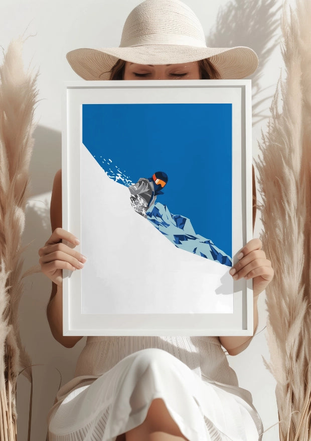 Plakat "Zjazd Snowboardzisty w Górskiej Scenerii" to uchwycenie chwili pełnej dynamiki i pasji, gdy snowboardzista pokonuje strome zbocza, otoczony majestatycznymi górami. Ten obrazek oddaje intensywność i radość płynącą z jazdy na śniegu, podkreślając więź człowieka z naturą.Podkreśl swoje zamiłowanie do zimowych sportów