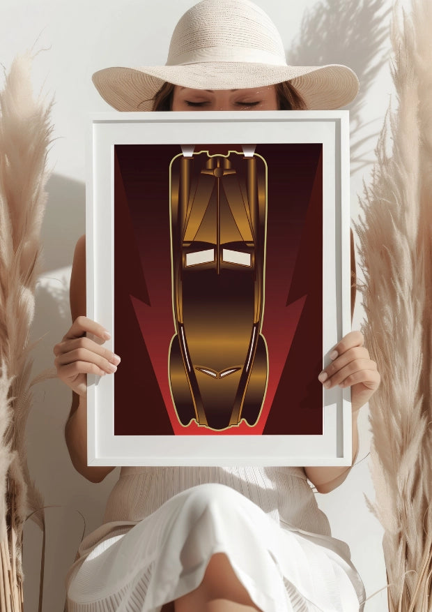 Ciemna, złota kolorystyka pojazdu kontrastuje z tłem, nadając wrażenie ruchu i dynamiki. Ostro zarysowane linie reflektorów dopełniają całości, nadając tej scenie poczucie siły i dominacji. To plakat, który ożywi każde wnętrze, dodając mu charakteru i luksusowego klimatu.Podkreśl swoje zamiłowanie do klasyki