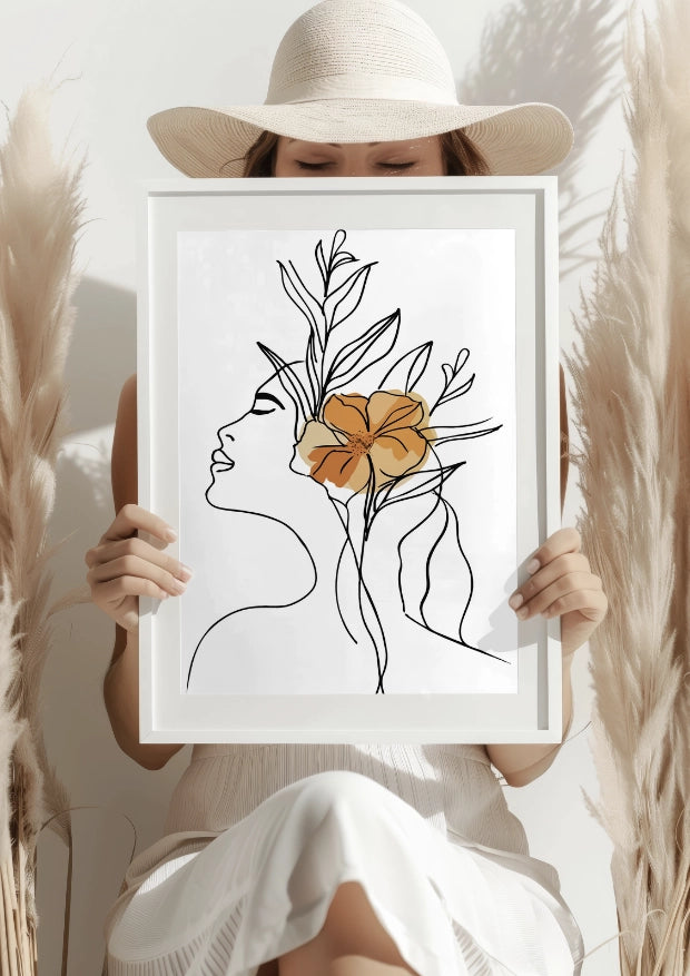 Ten plakat to hołd dla harmonii natury i kobiecości. Wyjątkowe połączenie delikatnych, roślinnych motywów z elegancką sylwetką przedstawia niepowtarzalną esencję siły i piękna. Kwiat otaczający postać zdaje się wprowadzać uczucie spokoju, które wypełnia przestrzeń wokół.Minimalistyczny styl o głębokim przekazie