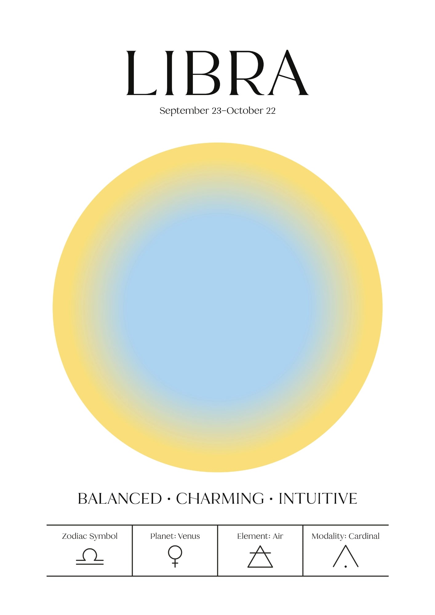 Ten plakat przedstawia subtelną aurę Wagi, która symbolizuje równowagę, intuicję i urok. Osoby urodzone między 23 września a 22 października mogą odnaleźć w tej kompozycji odzwierciedlenie swojej harmonijnej i eleganckiej natury. Aura w odcieniach błękitu i żółci wyraża pogodną i zrównoważoną energię, która idealnie wpisuje się w osobowość Wagi.Astrologiczne Symbole Wagi