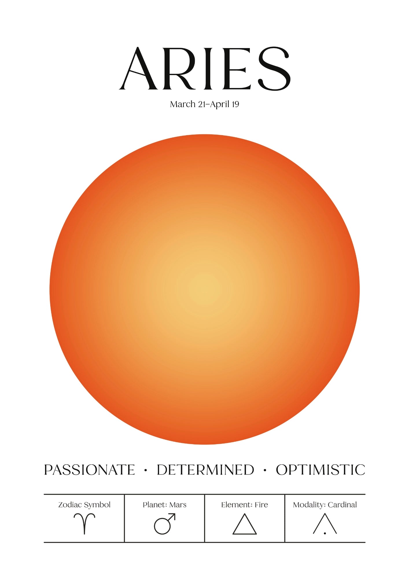 Plakat zawiera kluczowe astrologiczne symbole Barana – planetę Mars, żywioł ognia oraz modalność kardynalną. Połączenie tych elementów z intensywną aurą tworzy harmonijną całość, podkreślając nieustraszoność i gotowość Barana do podejmowania nowych wyzwań.Energetyczny Akcent w Twoim Wnętrzu