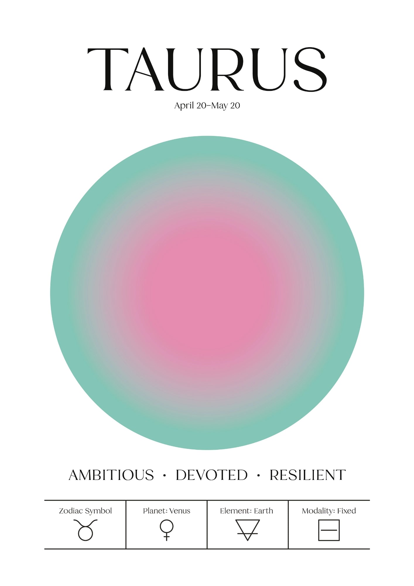Plakat przedstawia delikatną, wielokolorową aurę, która symbolizuje siłę, ambicję i oddanie Byka. Osoby urodzone między 20 kwietnia a 20 maja znajdą w tej kompozycji odzwierciedlenie swojej odpornej, a zarazem czułej natury. Aura w odcieniach różu i zieleni odzwierciedla stabilność i przywiązanie do materialnego świata, będące cechami charakterystycznymi Byka.Astrologiczne Symbole Byka
