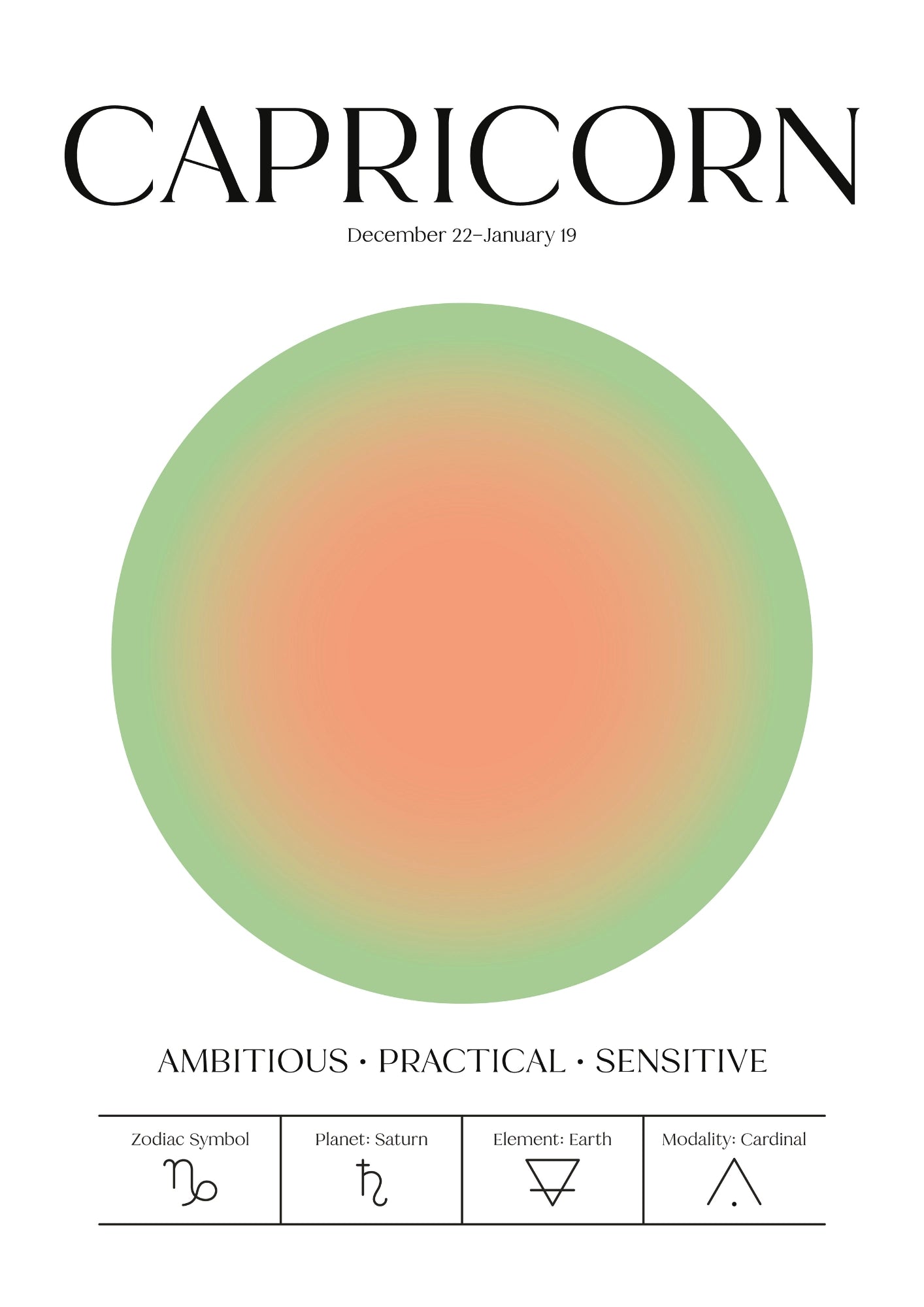 Plakat zawiera kluczowe astrologiczne symbole Koziorożca – planetę Saturn, żywioł ziemi oraz modalność kardynalną. Połączenie tych elementów z aurą tworzy harmonijną całość, odzwierciedlając siłę i praktyczność Koziorożca, który z niezachwianą determinacją dąży do swoich celów.Wyjątkowy Akcent Dekoracyjny