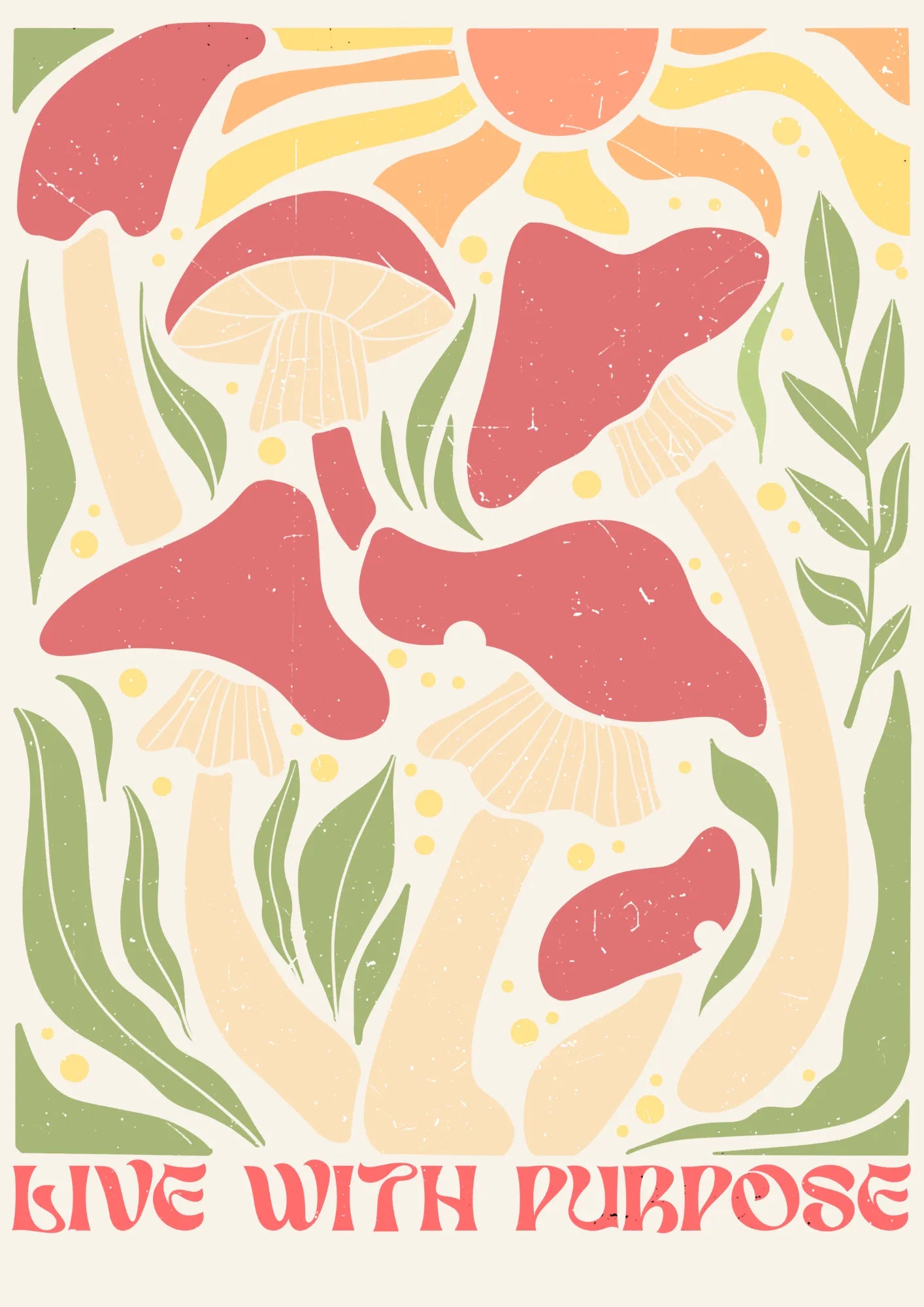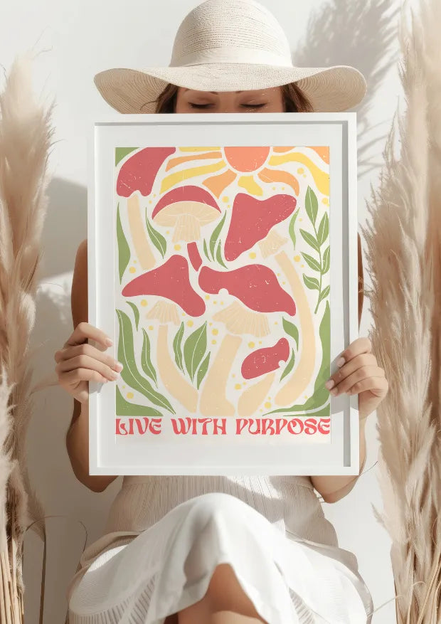 Plakat „Żyj Z Celem” to przypomnienie, że każdy dzień jest szansą na realizację naszych marzeń i celów. Radosna kompozycja kolorowych grzybów i liści ożywia wnętrze, dodając energii i pozytywnego nastawienia do każdego dnia. Słońce w tle symbolizuje nowe początki, które niesie każdy wschód.Barwne Detale Pełne Symboliki